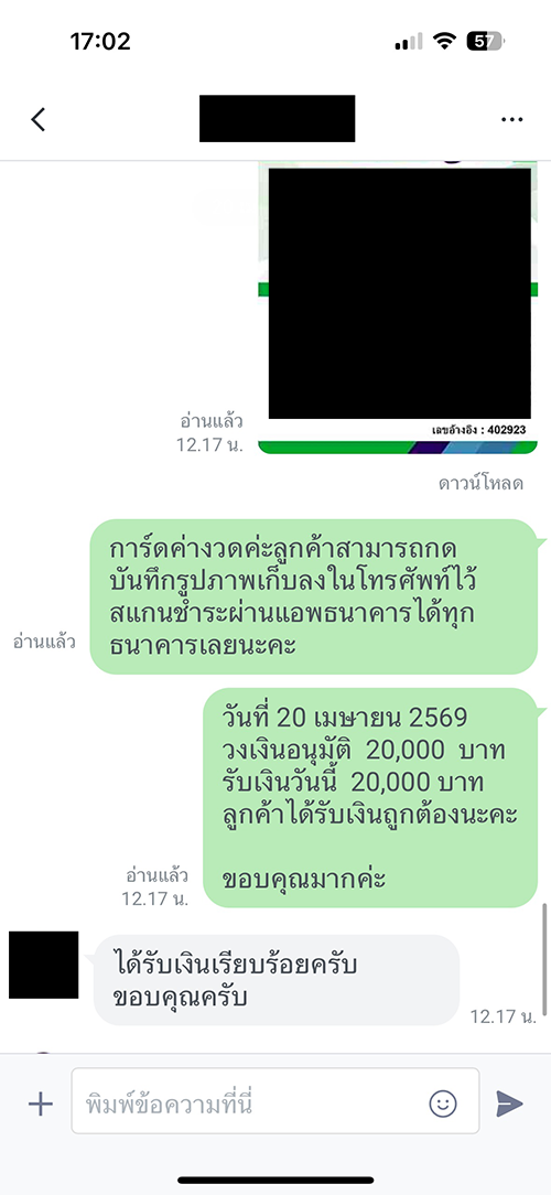 หากลูกค้าต้องการใบเสร็จ สามารถขอใบเสร็จ ได้เองทางไลน์อัตโนมัติของบริษัท หรือ เพียงเก็บสลิปโอนเงิน หรือ สลิปจ่ายค่างวด เป็นหลักฐานยืนยันการชำระค่างวดได้